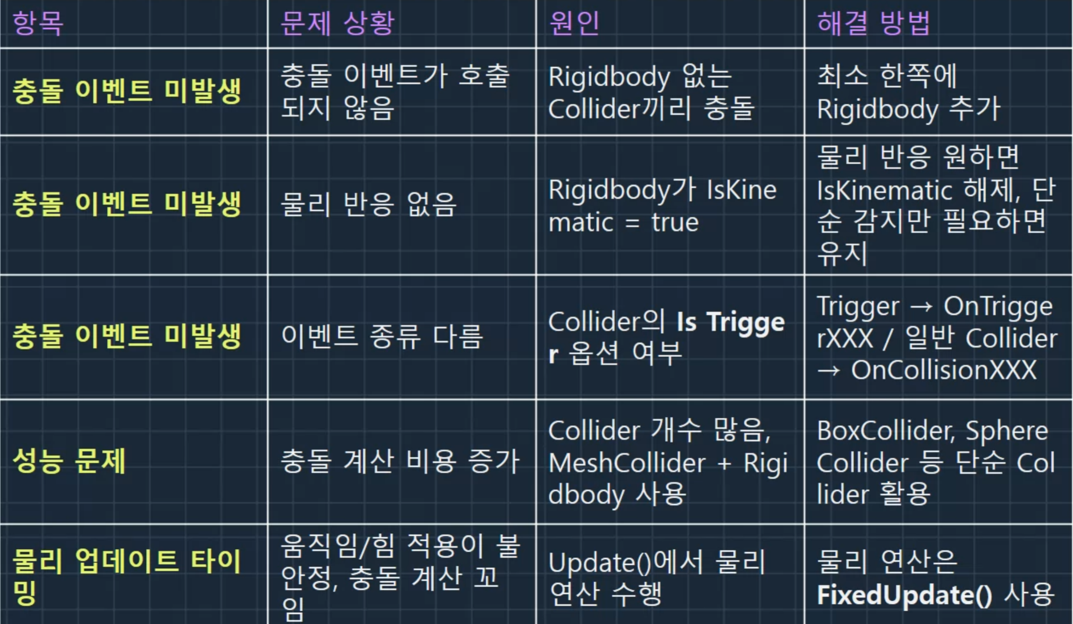 - 이 매트릭스를 사용하여 특정 레이어에 속한 오브젝트 그룹끼리만 충돌을 계산하도록 설정할 수 있습니다.